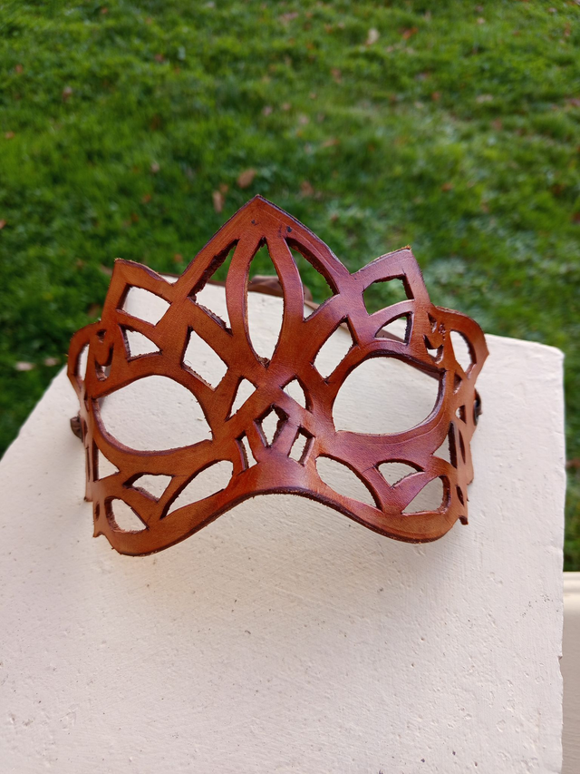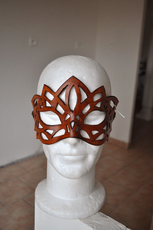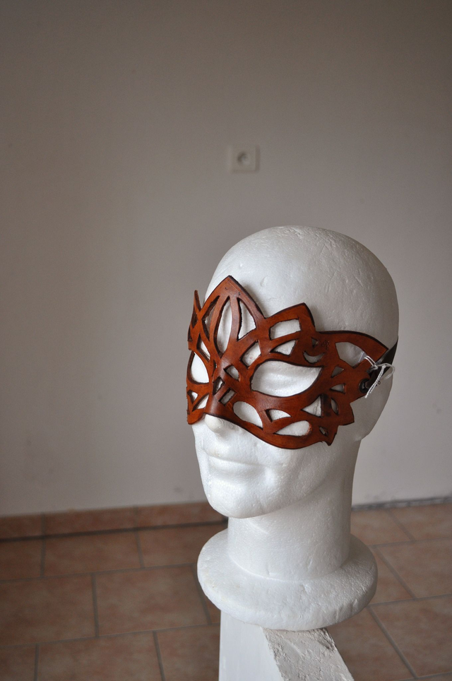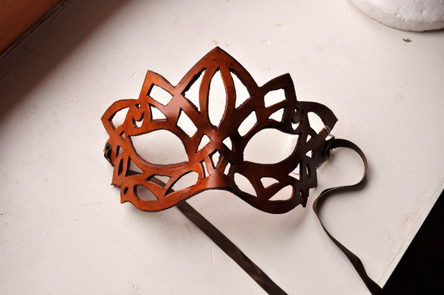 Masque en cuir ajouré, façon dentelle. Entièrement fait à la main, découpe et teinture