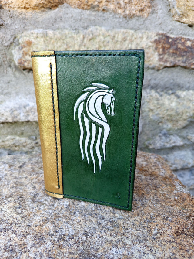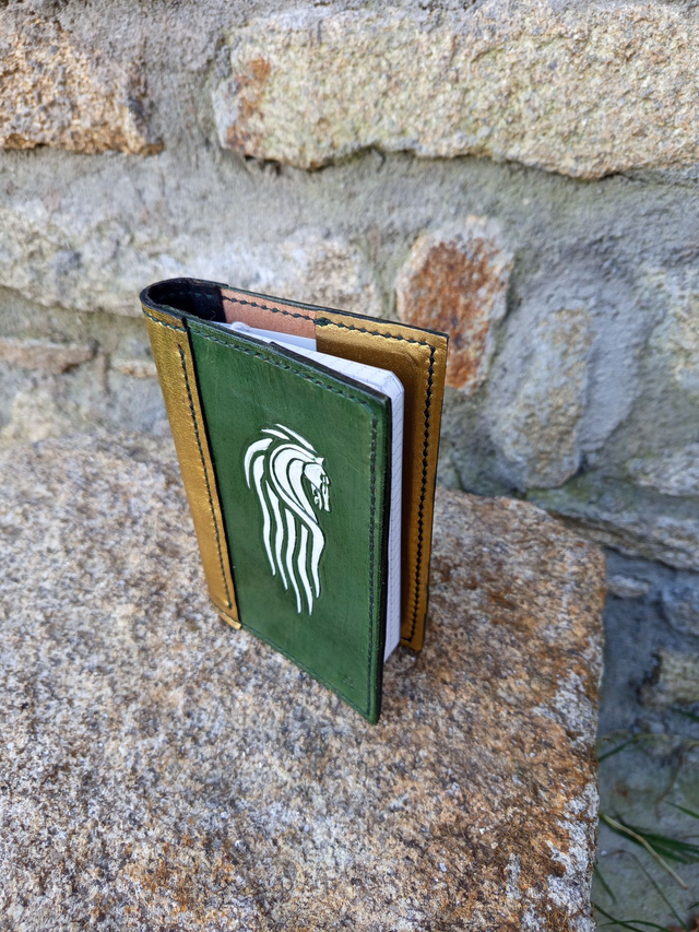 Petit carnet, avec couverture en cuir, entièrement faite à la main, teint en vert avec l'emblème du Rohan (Seigneur des anneaux)